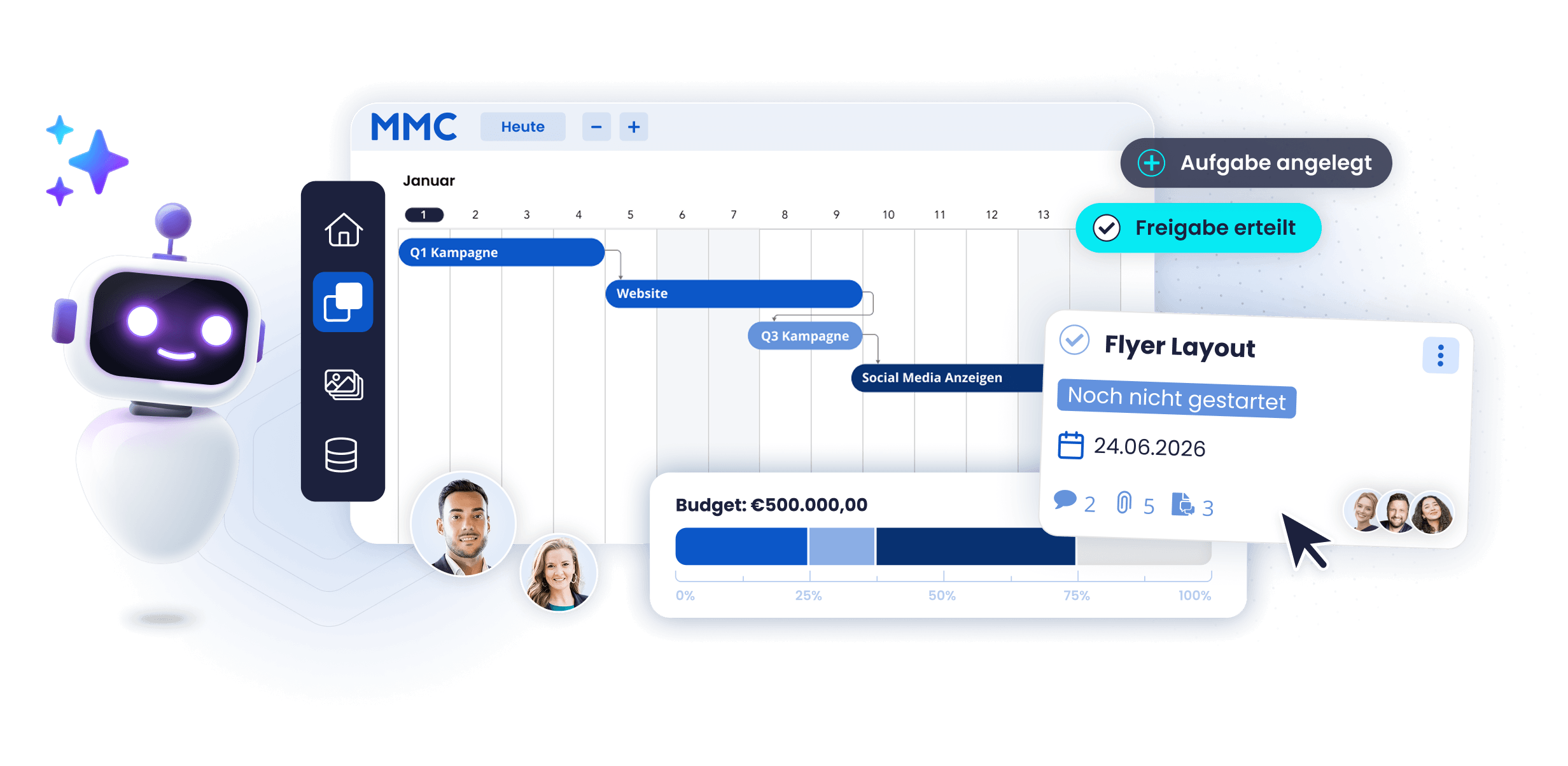 Das Management Center im MMC ist Ihre Basis für professionelles Marketing Resource Management: Von der ersten Idee bis zur finalen Auswertung. Alles zentral, transparent und effizient.