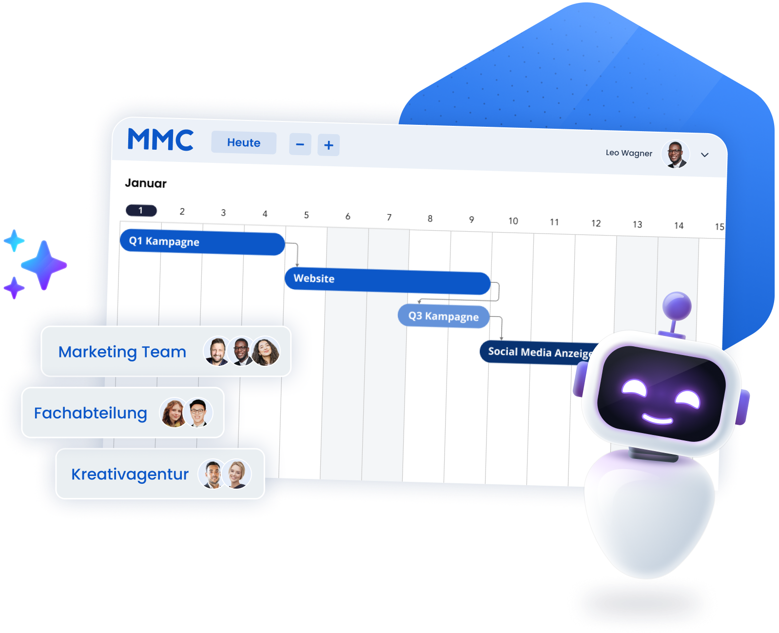 Für Ihr internes Team und externe Partner, unabhängig von der Teamgröße oder Komplexität Ihrer Kampagnen. Unterstützt durch Künstliche Intelligenz, die Routinearbeit vom Briefing bis zum Review begleitet.