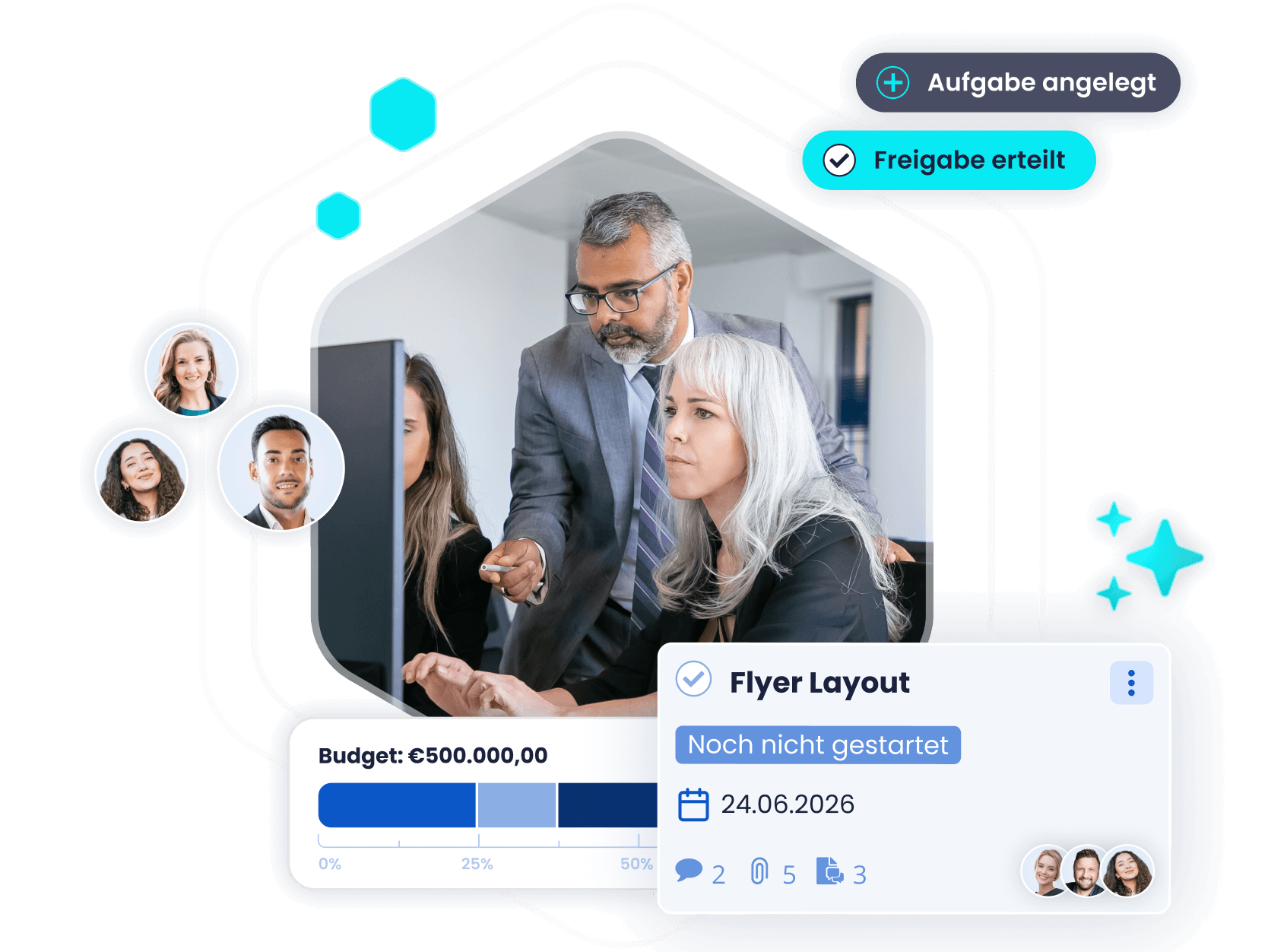 Aufgaben verteilen, Partner einbinden, Deadlines überwachen.